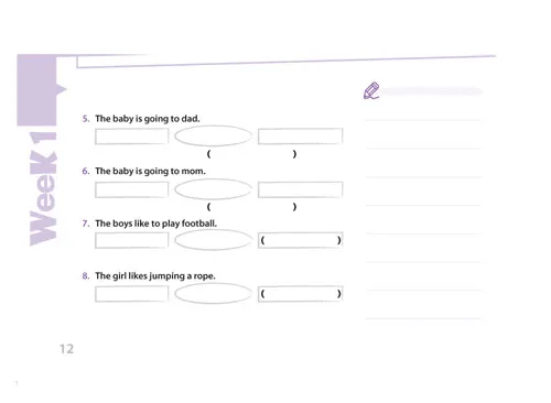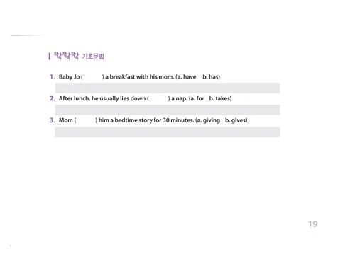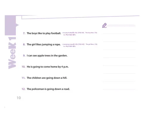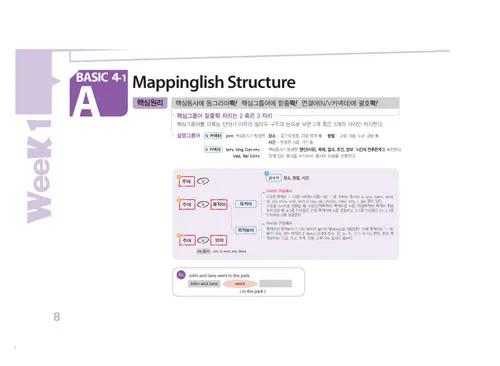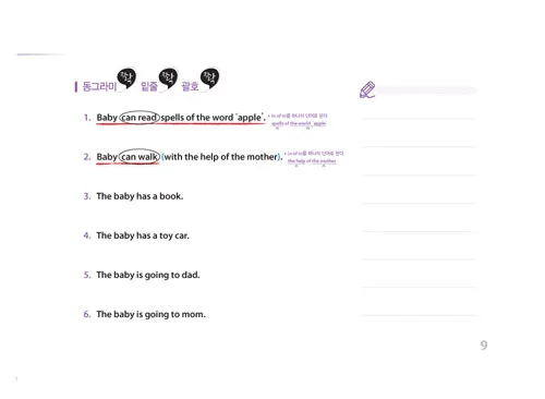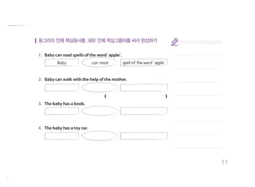 주어와 목적어에 밑줄, 동사를 찾아 동그라미 치고, 준단어 p+n는 괄호를 치면서 준단어가 위치에 따라 해석되는 문장확장 원리를 배움